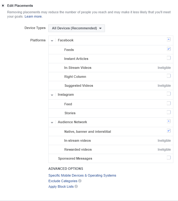 Din secțiunea Audience Network poți exclude opțiunile unde nu dorești afișarea anunțului, în funcție de business-ul promovat. În acest proces e important să ții cont și de buget: cu o sumă mică per zi nu vei reuși ca reclamele tale să fie afișate pe toate canalele, așa că poți testa cu doar 1-2 plasamente.