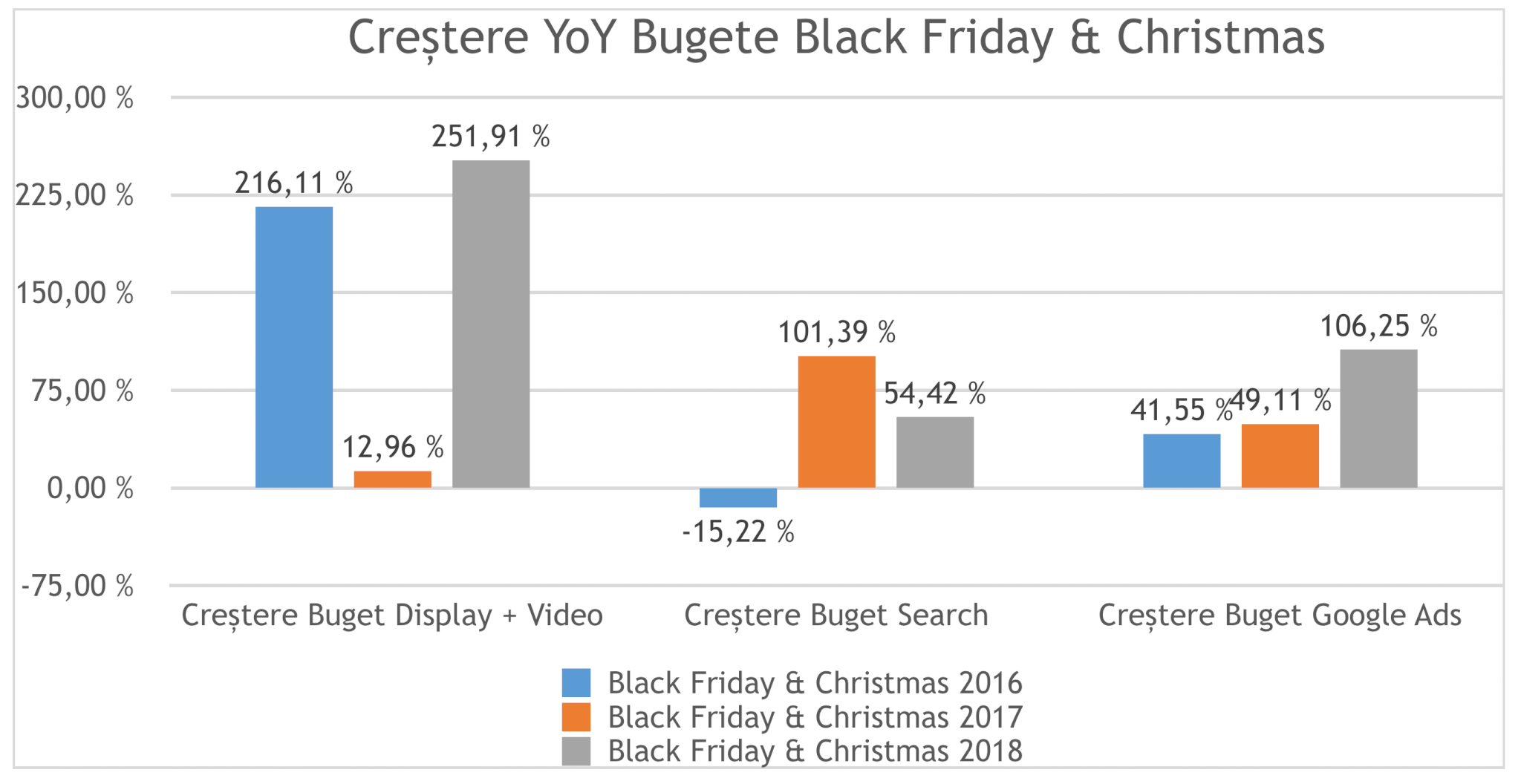 Perioadele de Crăciun și Black Friday, cu un comportament atipic, sunt cu atât mai importante să fie susținute de un mix de video și display, orientate și către conversii, întrucat rolul acestora se schimbă din awareness în conversii, perioada de achiziție fiind mai scurtă acum și impactul acestor campanii poate fi măsurat direct și într-un timp mai scurt.